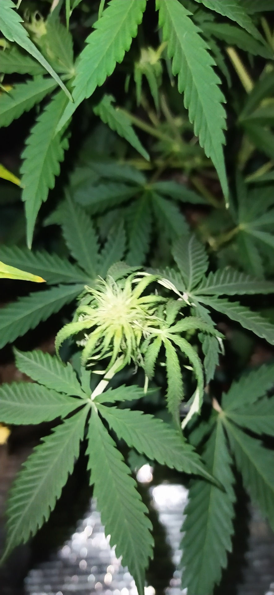 Hi Bros, im in early flower stage and the new leaves near the flowers looking like skinny?? What to do?? Is it light heat or nutrients def??
